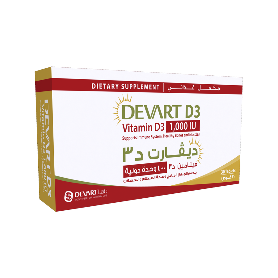 ديفارت د٣ يحتوى على ڤيتامين D3 بتركيز ١،٠٠٠ وحدة دولية (الجرعة اليومية الوقائية المُوصى بها عالمياً)، الذى يعمل على تعويض الجسم عن عدم التعرض للشمس، دعم الجهاز المناعي وتقويته، تقوية العظام و الأسنان وتحسين الحالة النفسية، وتحسين وظائف المشيمة لدعم صحة الأم والجنين، وتعزيز حساسية الأنسولين. بالإضافة إلى كافة المشاكل المصاحبة لفيتامين د3 في شكل أقراص (بلع) بدون أى أعراض جانبية.