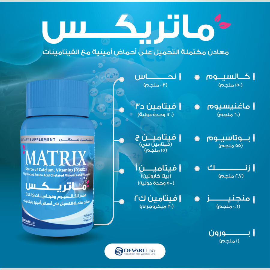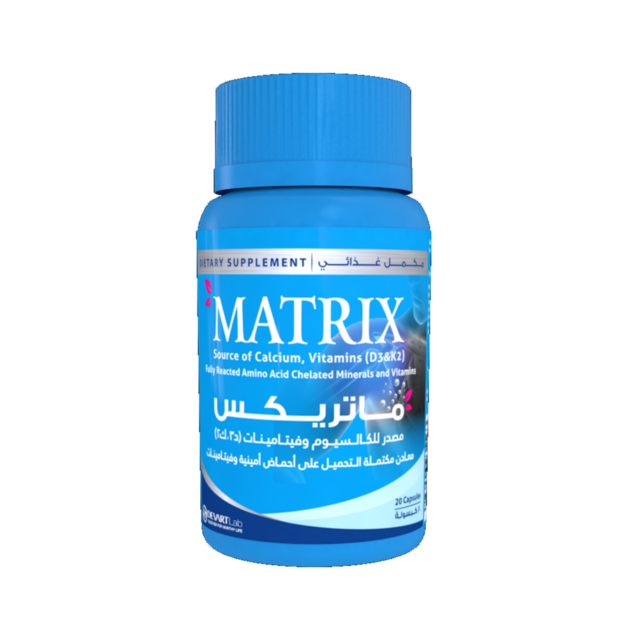 ماتريكس مكمل متكامل لعظام قوية مع كالسيوم، مغنيسيوم، زنك، وفيتامين د3 وك2. تقنية امتصاص 95% بدون آثار جانبية. اطلبه الآن!