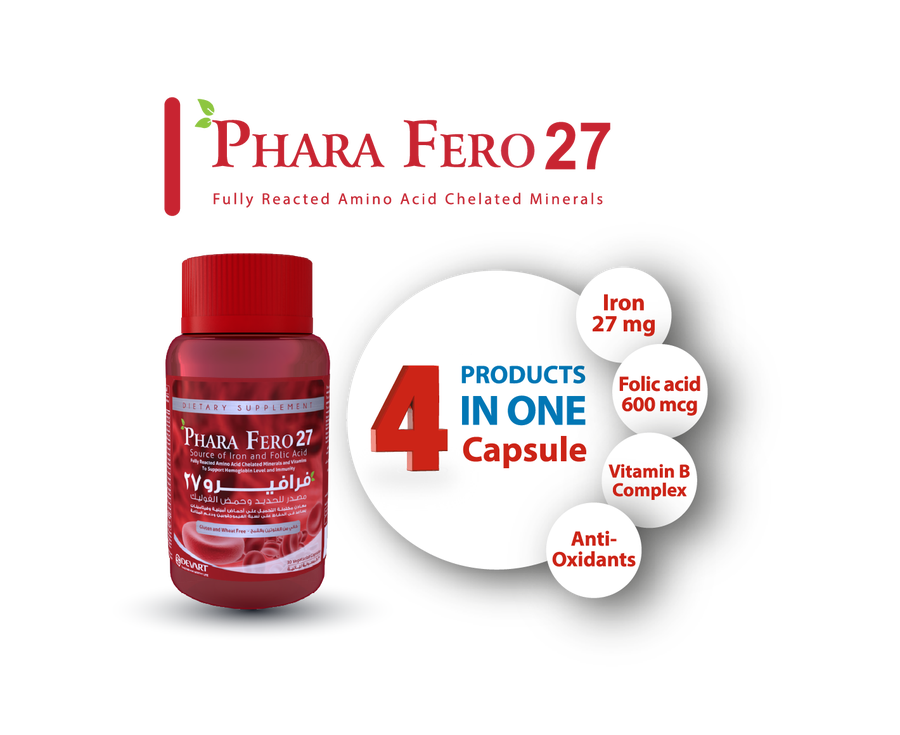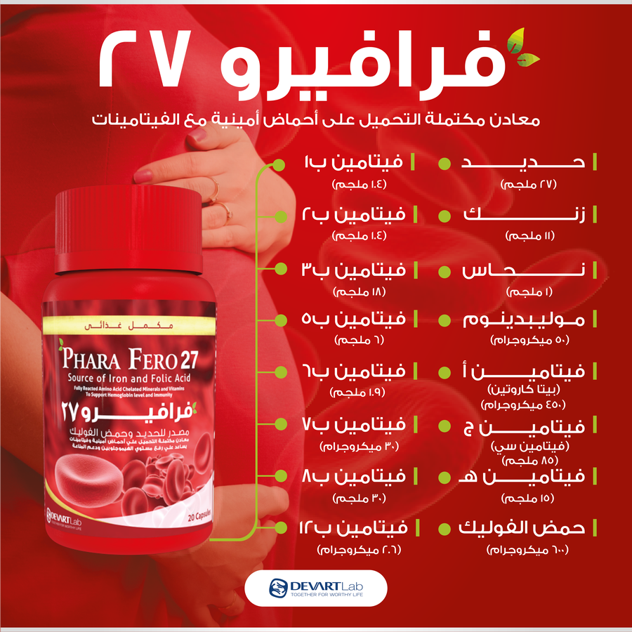 يساعد فرافيرو 27 على استعادة المعدل الطبيعي للهيموجلوبين في الدم، خاصة في حالات الأنيميا خلال فترتي الحمل والرضاعة، كما يعمل على تحسين مستوى الهيموجلوبين بمعدل يتراوح من 2 إلى 4 جم خلال شهر واحد، وفقًا لدرجة الأنيميا.