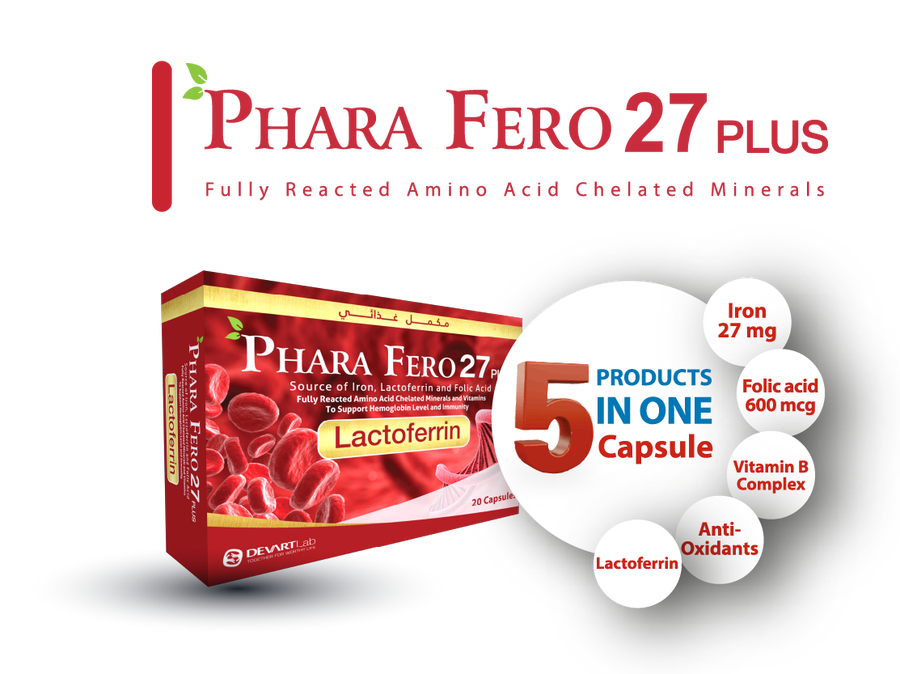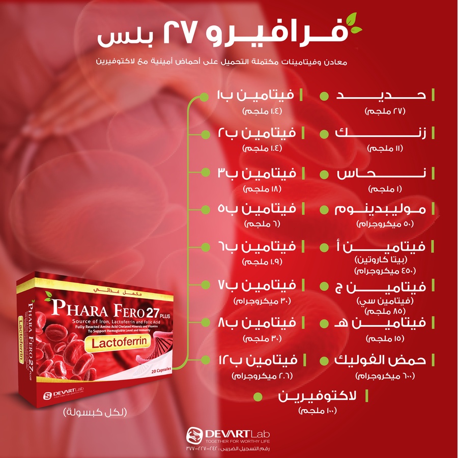 فرافيرو 27 بلس مع اللاكتوفيرين 100 مجم لعلاج الأنيميا أثناء الحمل والرضاعة والالتهابات. امتصاص فائق ومناعة قوية. تسوق الآن!