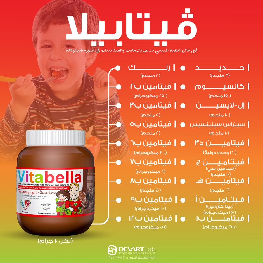 أول غذاء وظيفي وفاتح شهية طبيعي في مصر يحتوي على تركيبة فريدة من فواتح الشهية الطبيعية من ٣ معادن "الحديد والكالسيوم والزنك" مُصنعين بأحدث التقنيات التكنولوجية لضمان أعلى معدل امتصاص بالإضافة إلى ١٢ فيتامين "أ في صورة بيتا كاروتين، ب مركب بالكامل، ج، د٣، هـ" التي تساعد على فتح شهية طفلك وتقوية مناعته وعلى نموه السليم في صورة شوكولاتة رائعة المذاق.